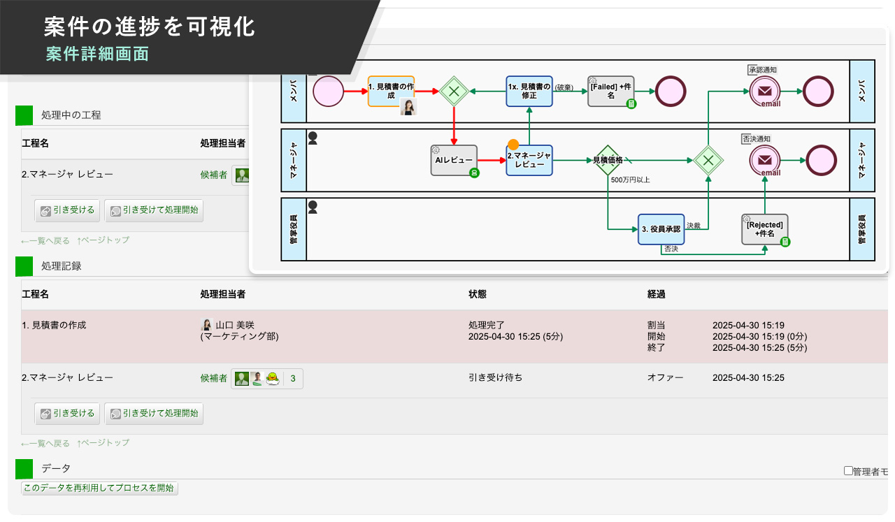 案件の流量や平均処理時間を把握し、ボトルネックを即座に特定可能。データを活用した業務改善により、スムーズな進行と処理効率の向上を実現します。