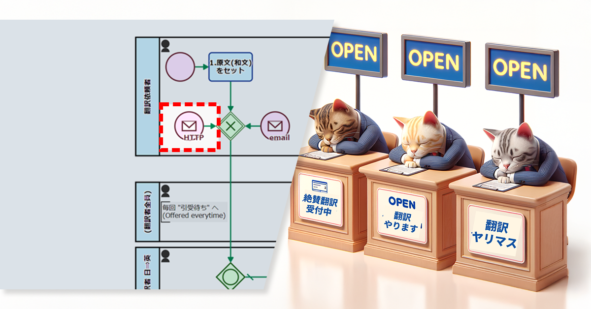 あるいは、親プロセスが “翻訳して欲しい和文” を、HTTP経由でリクエストします〔サービスタスク(子プロセス開始)〕⇒〔メッセージ開始イベント(HTTP)〕。 翻訳ワークフローの全工程が終了すれば、成果物が親プロセスに戻されます。